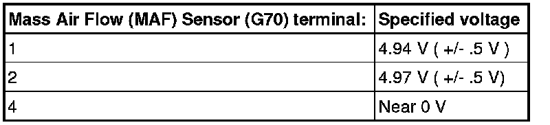 - Using a multimeter, check the Mass Air Flow (MAF) Sensor (G70) electrical harness connector terminal 5 to engine Ground for voltage.