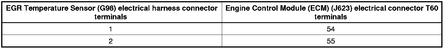 - Using a multimeter, check the EGR Temperature Sensor (G98) electrical harness connector terminals to the Engine Control Module (ECM) (J623) electrical harness connector T60 terminals for an open circuit. Refer to Wiring Diagrams for Pin locations.