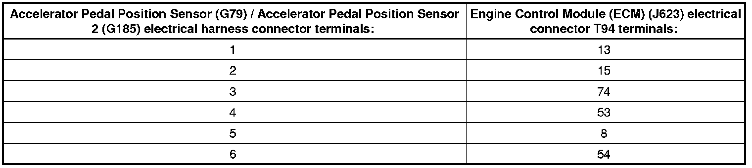 - Using a multimeter, check the Accelerator Pedal Position Sensor (G79) / Accelerator Pedal Position Sensor 2 (G185) electrical harness connector terminals to the Engine Control Module (ECM) (J623) electrical connector T94 for an open circuit. Refer to Wiring Diagrams for pin locations.