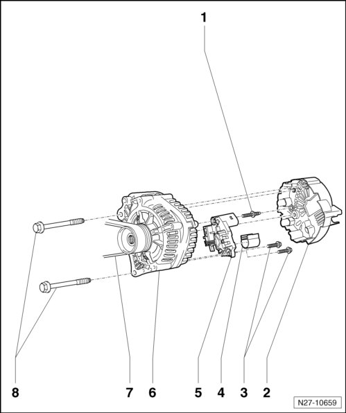 • Generator ribbed belt pulley, removing and installing, refer to => [ Ribbed Belt Pulley Without Freewheel ] Ribbed Belt Pulley Without Freewheel, => [ Ribbed Belt Pulley with Freewheel, Bosch ] Ribbed Belt Pulley With Freewheel, Bosch or => [ Ribbed Belt Pulley with Freewheel, Valeo ] Ribbed Belt Pulley With Freewheel, Valeo.