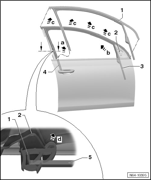 - From the inside, fold back the sealing lip on the window guide - 1 - from the window frame - arrow d -.