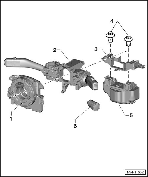 • There are different versions of the steering column electronic systems control module (J527) , the steering column combination switch (E595) and the steering column switch base carrier depending on the manufacturer (Valeo or Kostal). The Valeo version is shown in the illustration.