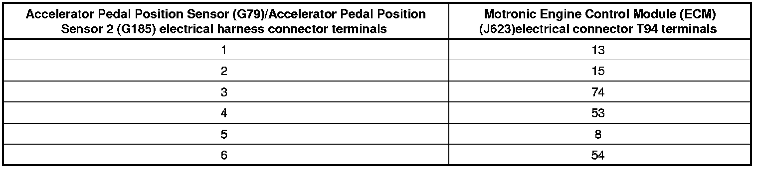 - Using a multimeter, check the Accelerator Pedal Position Sensor (G79)/Accelerator Pedal Position Sensor 2 (G185) electrical harness connector terminals to the Motronic Engine Control Module (ECM) (J623) electrical connector T94 for an open circuit. Refer to Wiring Diagrams for pin locations.