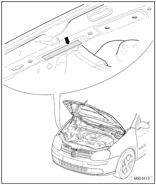 Vehicle data plate - arrow - is secured in spare wheel well on left side in direction of travel.
