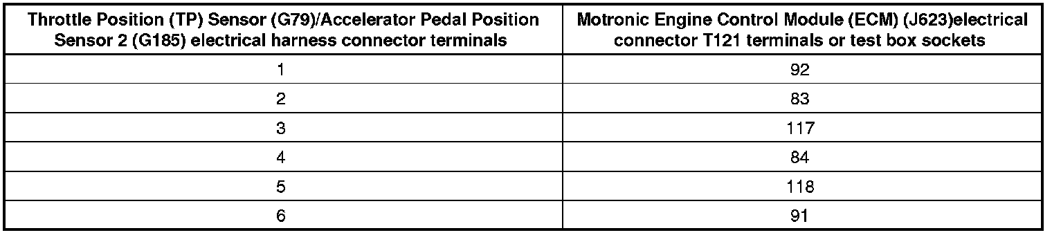 - Using a multimeter, check the Throttle Position (TP) Sensor (G79)/Accelerator Pedal Position Sensor 2 (G185) electrical harness connector terminals to the Motronic Engine Control Module (ECM) (J623) electrical connector T94 for an open circuit.