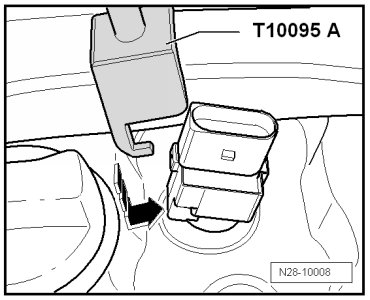 - Place the assembly tool (T10118) on the locking button - arrow - and carefully pull the connector up.