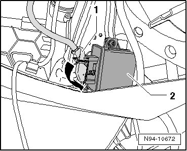 - Unlock the connector in - direction of arrow - and disconnect the connector - 1 - from the headlamp range/cornering lamp control module - 2 -.