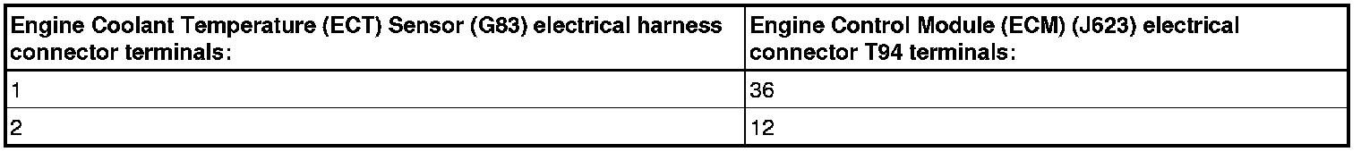 - Using a multimeter, check the Engine Coolant Temperature (ECT) Sensor electrical harness connector terminals to the Engine Control Module (ECM) (J623) electrical harness connector T60 terminals for an open circuit or a short to voltage, refer to the chart below.