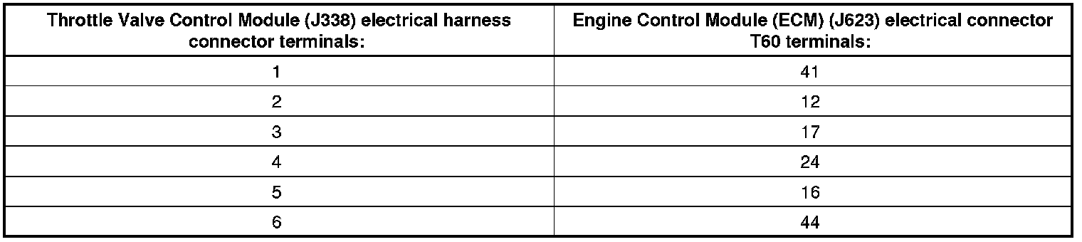 - Using a multimeter, check the Throttle Valve Control Module (J338) electrical harness connector terminals to the Engine Control Module (ECM) (J623) electrical harness connector T60 terminals for a short to ground or an open circuit according to the chart below.