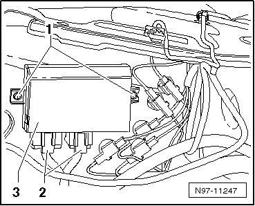 - Remove the nuts - 1 - and the towing recognition control module - 3 - from the duo bolts in the side panel.