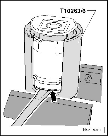 - Using a screwdriver, pry between the tube (T10356/6) and the rubber bonded bushing - arrow - and, if necessary, remove the bushing by tapping lightly on the screwdriver with a hammer.