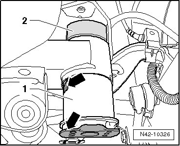 - Install the bonded rubber bushing - 1 - into the subframe, so that the tab and the plate - arrows - face perpendicular to the direction of travel.