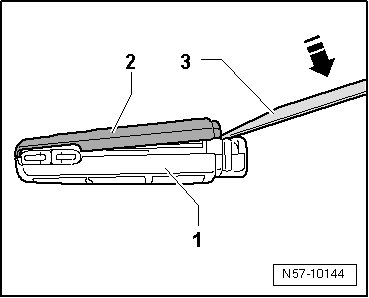 - Remove the cap - 1 - forcefully from the ignition key - 3 - in the direction - arrow - of the side button - 2 -.