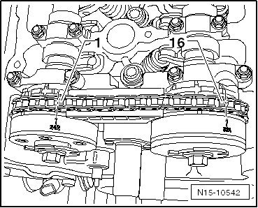 - The distance between the marks on the camshaft adjuster must be exactly 16 rollers of the timing chain.