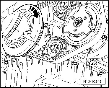 • The arrows on the camshaft adjusters must line up with the notches on the right side of the control housing. For the marks on the control housing, refer to => [ Marks on the Control Housing with FSI Engines ].