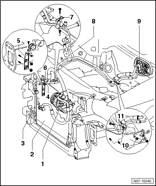 • Removing, refer to => [ Evacuating and Charging Valves, Low and High Pressure Side ] Evacuating and Charging Valves, Low and High Pressure Side.
