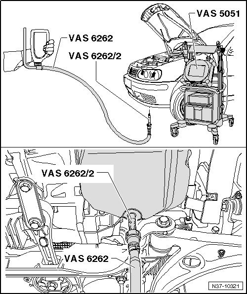 - Connect the adapter for oil filling (VAS 6262) quick release coupling to the adapter for oil filling (VAS 6262 A) and check: