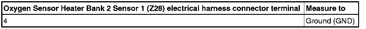 - Using a multimeter, check the Oxygen Sensor Heater Bank 2 Sensor 1 (Z28) terminals 3 to 4 for resistance.