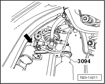 - Clamp off the hose to the EVAP canister purge regulator valve 1 using a hose clamp up to 25 mm dia. (3094) - arrow -.
