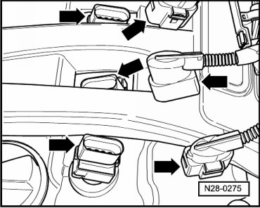 - To install, insert the ignition coil with power output stage into the corresponding spark plug shaft so that the straight sides of the connectors fit with each other - arrows -.