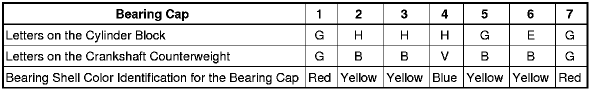 Using the letters on the cylinder block and crankshaft, determine the correct color identification for the bearing shell in the bearing cap (lower bearing shell)