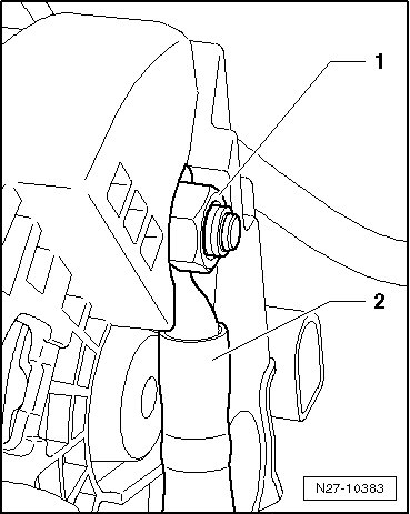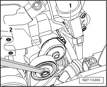 - Remove the nut - 1 - on the tensioner - 2 - and remove the tensioner.