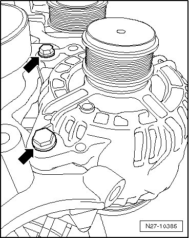 - Release tension on ribbed belt by swinging tensioning element using a 16 mm open-end wrench in direction of - arrow -.