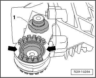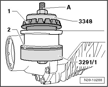 - Remove the bonded rubber bushing - 1 - using the front and rear bearing tool (3348) and a plastic mallet.