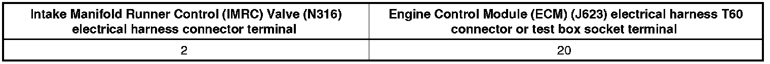 - Using a multimeter, check the Intake Manifold Runner Control (IMRC) Valve (N316) electrical harness connector terminal to the Engine Control Module (ECM) (J623) electrical harness connector terminal for resistance.