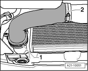 - Remove the charge air hose - 1 - from the charge air cooler and remove the hose downward.