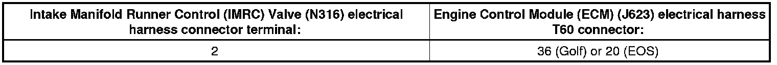 - Using a multimeter, check the Intake Manifold Runner Control (IMRC) Valve (N316) electrical harness connector terminal to the Engine Control Module (ECM) (J623) electrical harness connector terminal for resistance. Refer to the Wiring Diagrams.