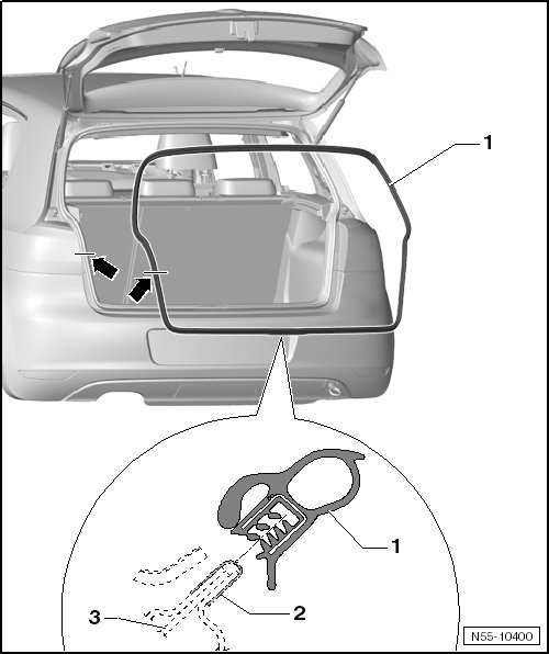 - Align the rear lid seal - 1 - with the vulcanized point - arrow - on the tail lamp - arrow -.