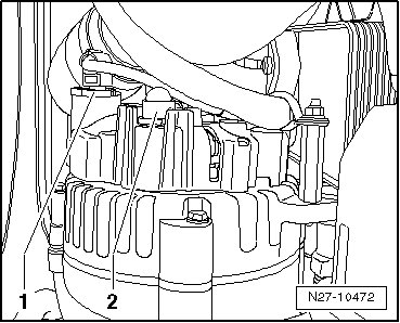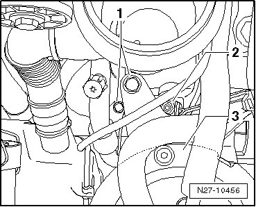 - Remove both of the bolts - 1 - and the nut - 2 - for the fuel filter - 3 - and lay them aside. The fuel hoses can remain connected.