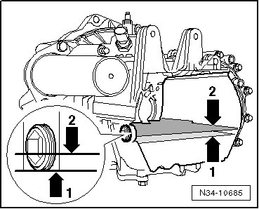 Due to the angle of the engine/transmission assembly, the lower edge of the fill hole - arrow 1 - is located below the fluid level - arrow 2 -.
