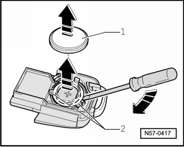 - Use a screwdriver to unclip battery - 1 - out of holders - 2 - in - direction of arrow -.