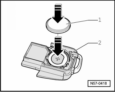 - Place battery - 1 - in radio-frequency unit - 2 - with positive terminal downward (positive terminal is marked in housing).