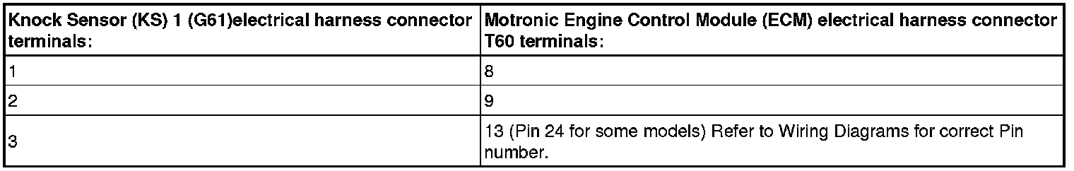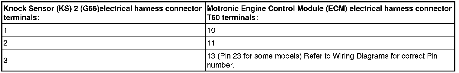 - Disconnect the Knock Sensor (KS) 1 (G61) electrical harness connector or the Knock Sensor (KS) 2 (G66) electrical harness connector.