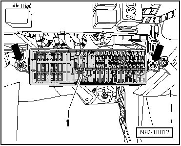 - Remove the screws - arrows - and pull the fuse panel - 1 - downward out of its bracket.