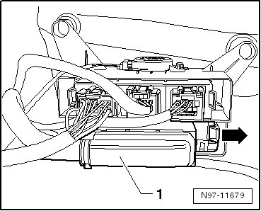 - Press the button - arrow - on both sides toward the outside and remove the electro-mechanical parking brake control module - 1 -. Be careful of the wires still connected.