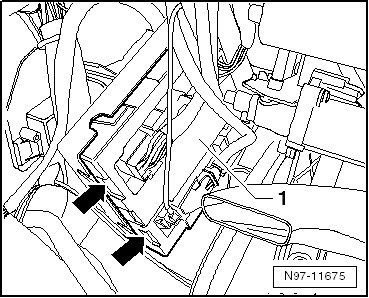 - Open both retainers - arrows - and remove the Comfort system central control module - 1 - downward. Pay attention to the wires still connected.