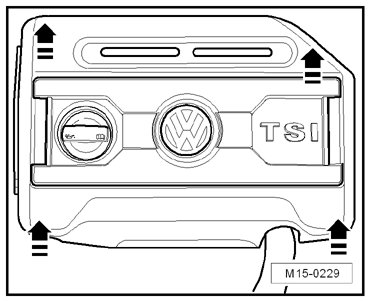 - Gently pull the engine cover up, at the locations of the - arrows -.