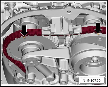 - Rotate the crankshaft from above, using with the socket SW 24 on the vibration damper bolt, in the engine rotation direction until the marks - arrows - are on top.