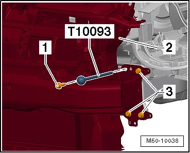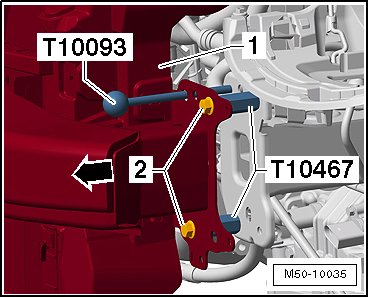 - Pull the lock carrier with attachments - 1 - on the special tool (T10093) toward the front - arrow -. Be careful of the electric wires on the lock carrier. Disconnect the connectors if necessary.