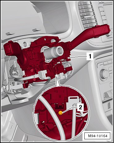 - Remove the screw - 2 - (below) and remove the steering column combination switch - 1 - straight back from the steering column switch mount.