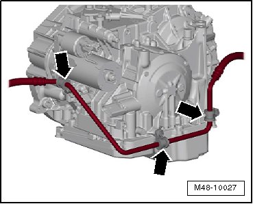 Expansion Hose Routing on the Automatic Transmission - arrows -