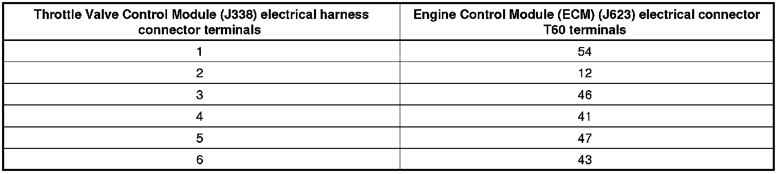 - Using a multimeter, check the Throttle Valve Control Module (J338) electrical harness connector terminals to the Engine Control Module (ECM) (J623) electrical harness connector T60 terminals for an open circuit according to the wiring diagram. Refer to Wiring Diagrams for pin locations.