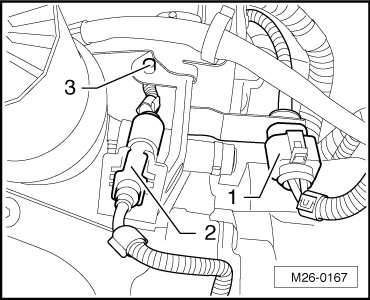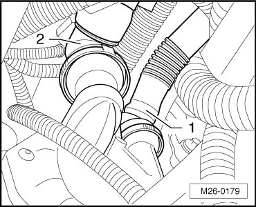 - Disconnect the pressure hose - 1 - and intake hose - 2 -. To do so, compress the securing ring.