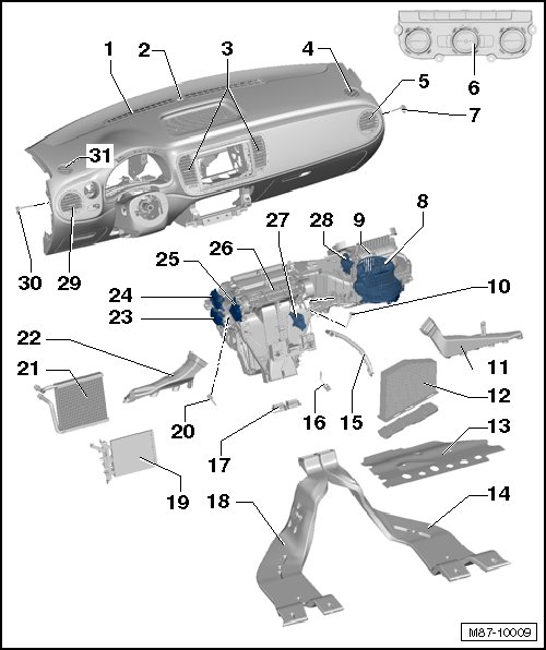 • The air distribution is activated using the defrost intermediate piece, refer to item 10 => [ (Item 10) Intermediate Piece For The Defrost Air Vent ] Air Vent Overview.
