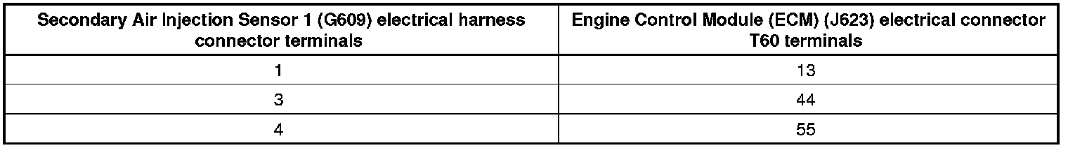 - Using a multimeter, check the Secondary Air Injection Sensor 1 (G609) electrical harness connector terminals to the Engine Control Module (ECM) (J623) electrical harness connector T60 terminals for an open circuit. Refer to Wiring Diagrams for pin locations.