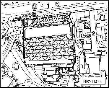 - Remove both nuts - 1 - and the comfort system central control module with the bracket - 2 - from the fastener threads. Be careful of the connected wires.